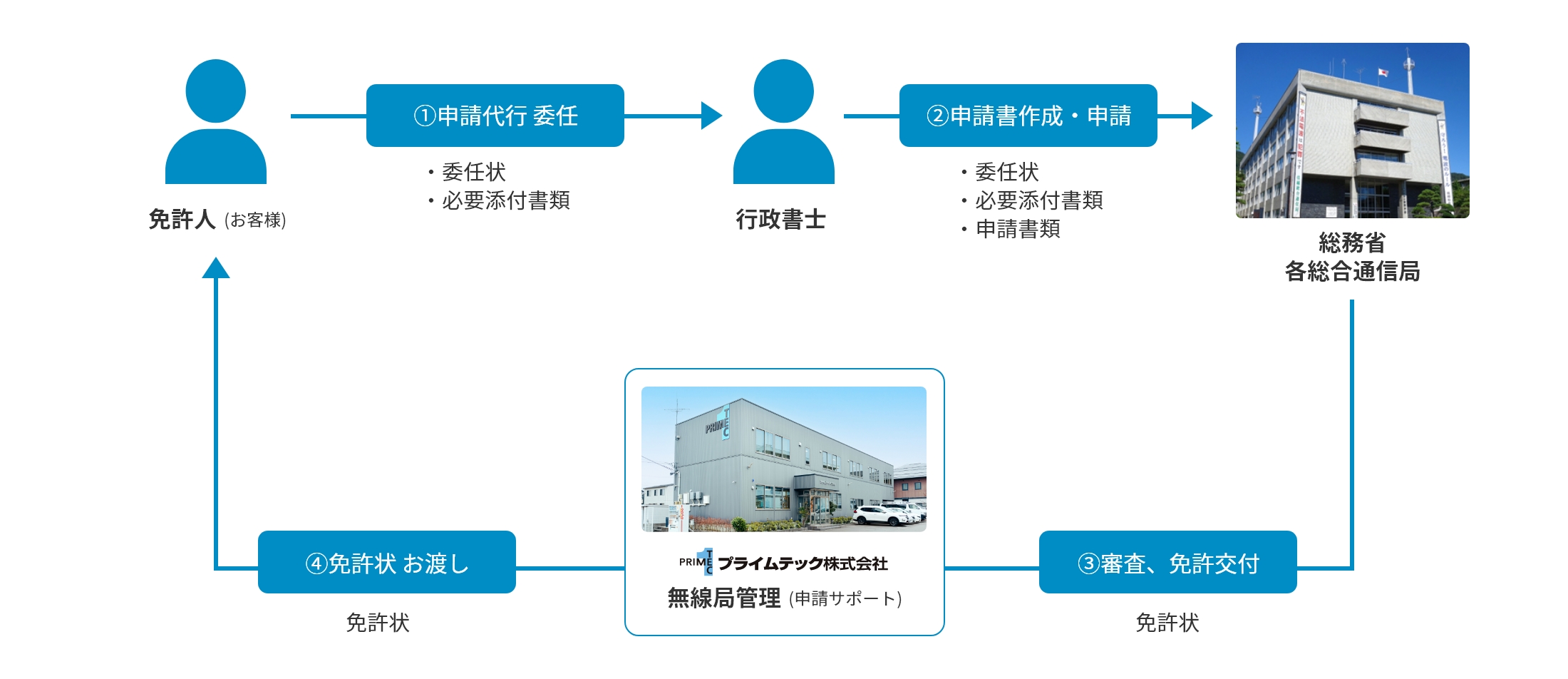 電波法により、業務用無線機の使用には、免許の申請が義務付けられています。