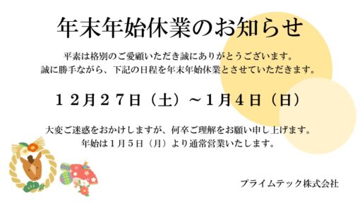 弊社では、2025年12月27日(土)~2026年1月4日(日)まで