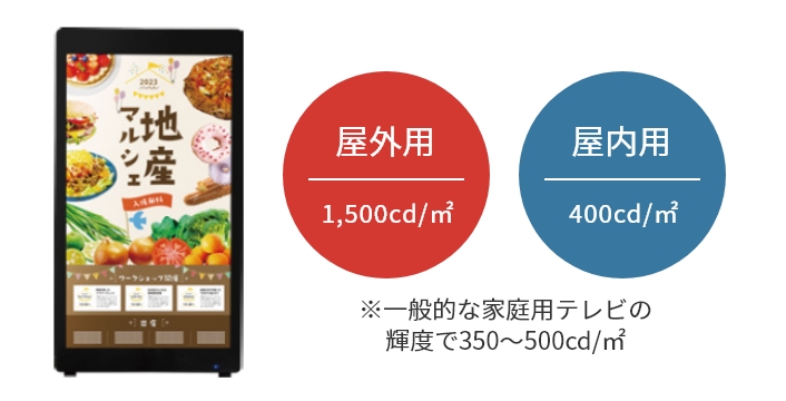 屋内用(400cd/㎡)、屋外用(1,500cd/㎡)の高輝度ディスプレイは、明るく鮮やかな動画も放映でき、音も出せるため、遠くからでも視認性は高まり、道行く人の視線をこちらに向けることができます。