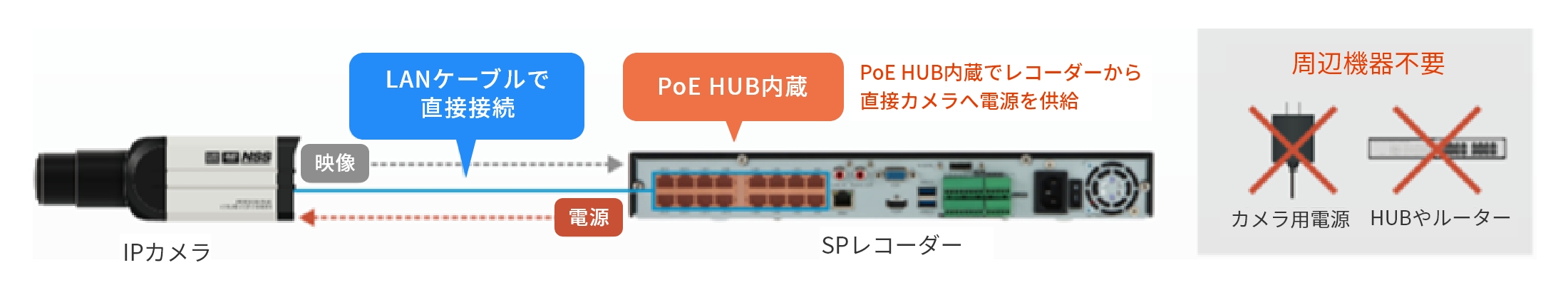 アナログシステムの様にカメラとレコーダーをLANケーブルで直接接続するだけで簡単に再生・録画を開始できます。また、SPシリーズのレコーダーは「PoE HUB内蔵」のため、別途カメラ側に電源を用意する必要もありません。