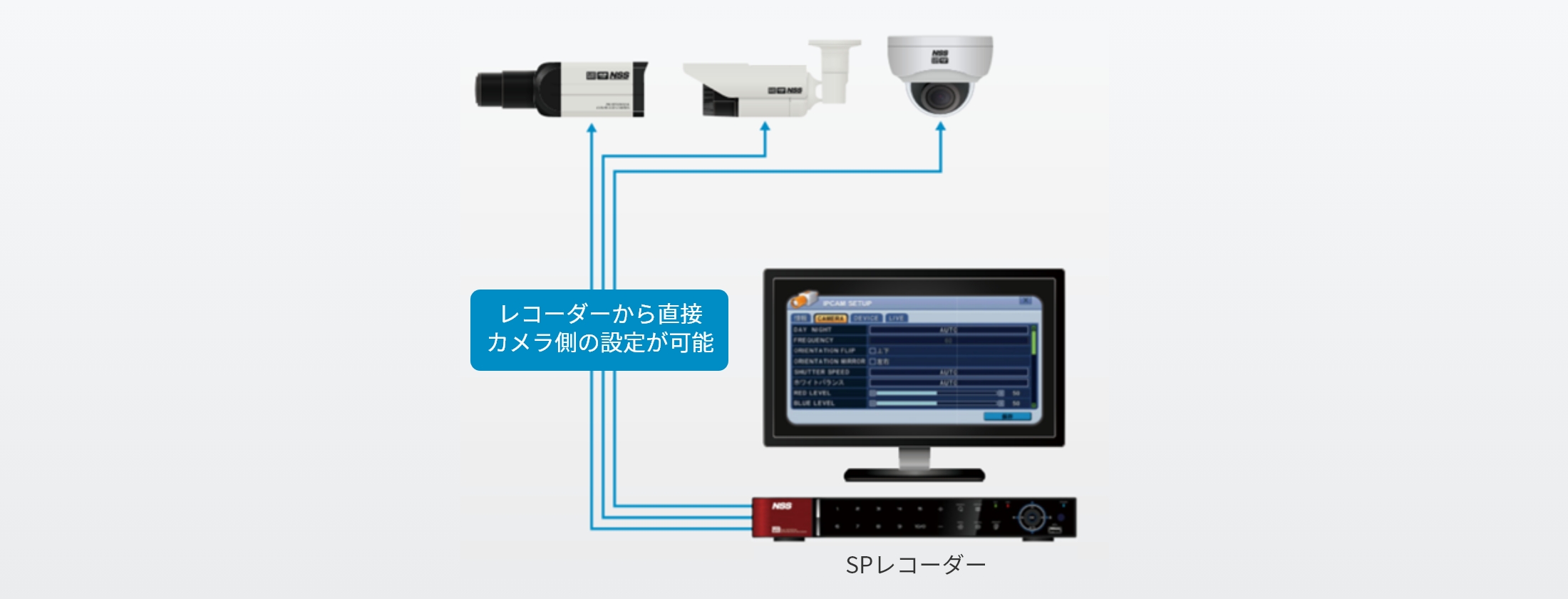 従来のIPシステムでカメラ設定を行う際、PCを使ってカメラに接続し、設定を行っていましたが、SPシリーズでは、PCを使うことなくレコーダーから直接カメラ側の設定まで行えます。