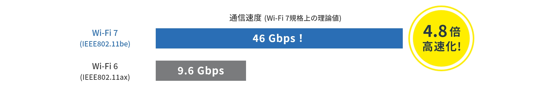 Web会議をはじめとするコミュニケーションツールや、リアルタイム性が求められるAR/VRを快適に利用するには高速かつ安定性の高い通信が必要不可欠なものとなっています。Wi-Fi 7では変調方式や周波数帯域の効率化により、Wi-Fi 6に比べ理論値上は通信速度が4.8倍に向上しています。