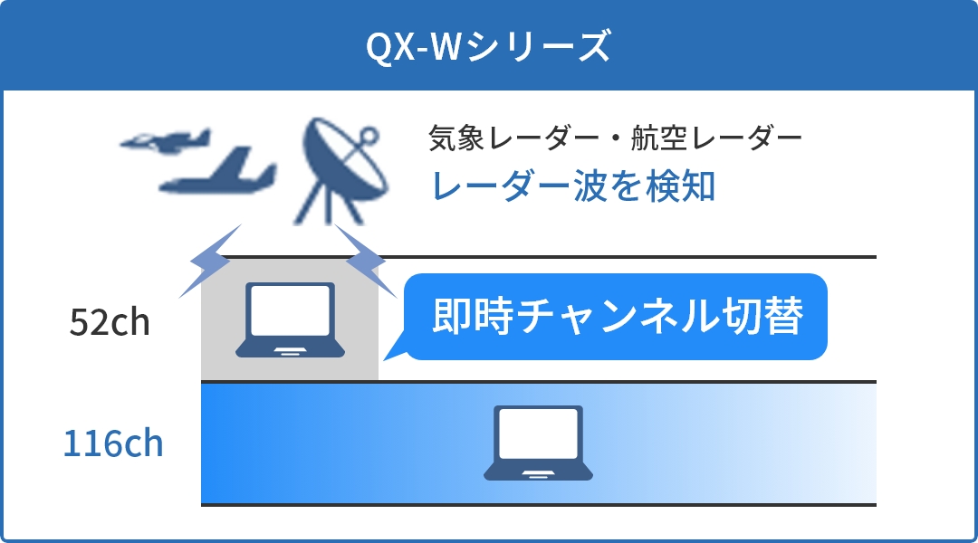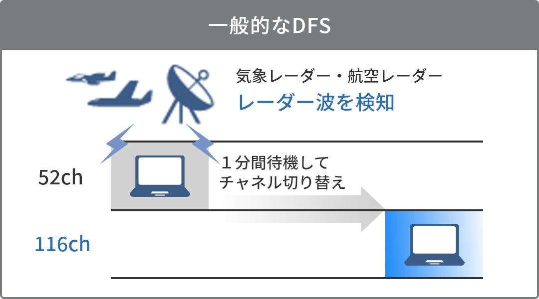 Fast DFS機能により、気象/航空レーダー波を常時監視することで、レーダー波を検知した瞬間にチャネルの瞬時切り替えを実施し、快適で安定した通信を実現します。