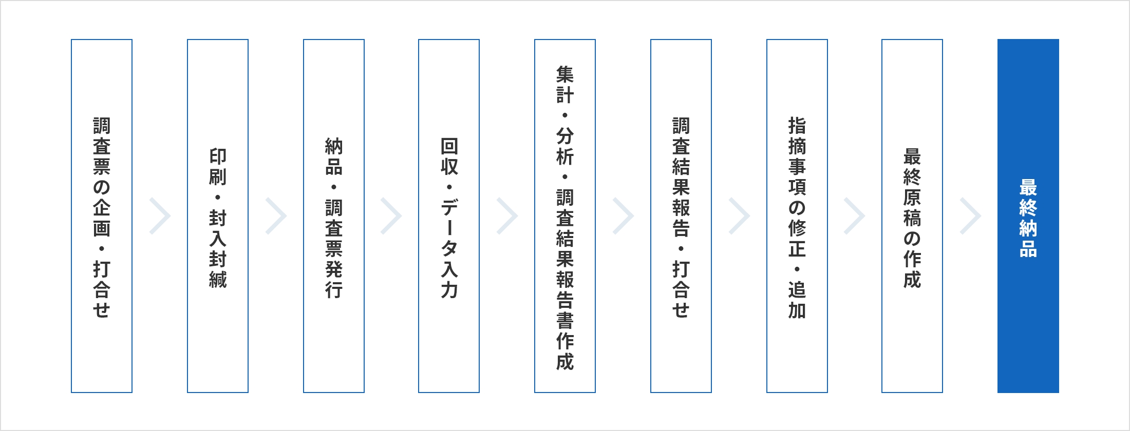 決定した調査票について、発送準備作業や調査票のデータ入力、集計、調査結果報告書の作成、お客様への説明・報告など、必要とされる作業すべてに対応します。