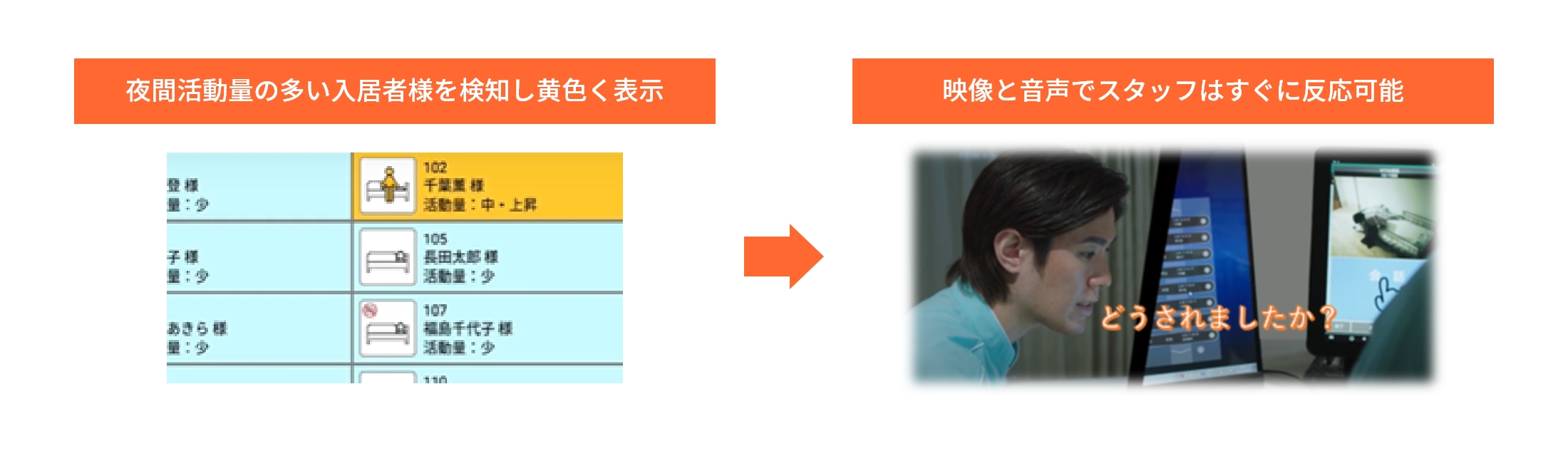 夜間ドアを開けることを嫌う入居者様の様子や、センサー頻回な方がどのような状態かを確認できるほか、夜間帯に体動の激しい方の見守りや、転倒リスクのある方の転倒防止などに活かしています。