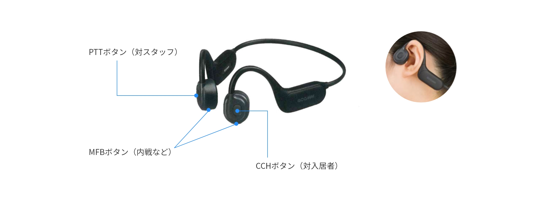 - 右耳で施設スタッフ、左耳で入居者様と通話。 効率的なコミュニケーションで差別化を実現。