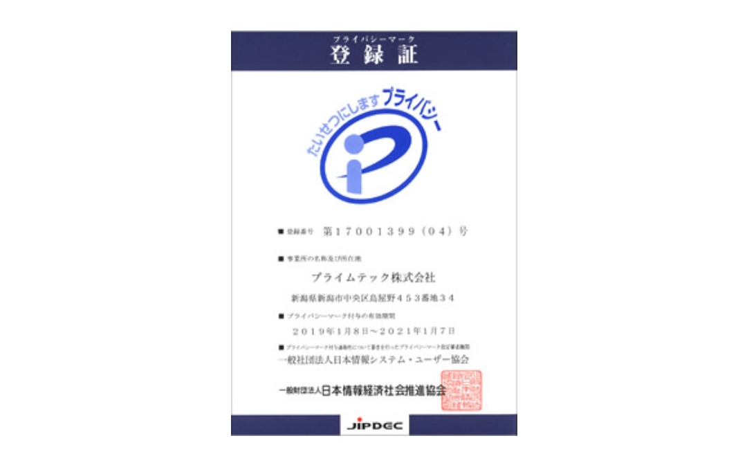 弊社は、第三者機関による厳重な個人情報管理体制審査に合格し、個人情報保護規定のプライバシーマークを取得しております。社内セキュリティだけではなく、徹底した個人情報を管理し、お客様の安心の企業を目指してまいります。個人情報保護については、個人情報保護方針、各種マニュアル及び要領に準じた運用を遵守しています。